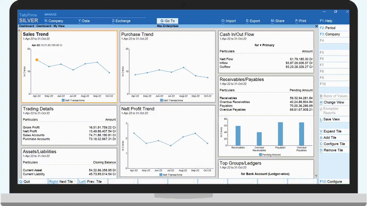 TallyPrime provides a powerful reports dashboard that presents your business data in clear and intuitive visual formats. You can add, hide, configure, and organize information tiles to match your preferences. The dashboard helps you view key business insights effortlessly, making smarter decisions easier and more effective.